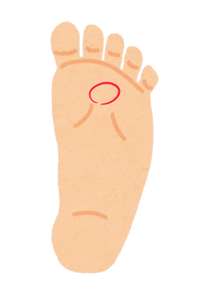 - 湧泉(足指をグーにしたときにへこんでいるところ)~高血圧改善、疲労回復、肩こり改善